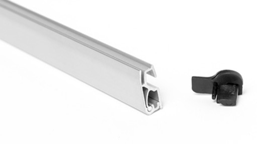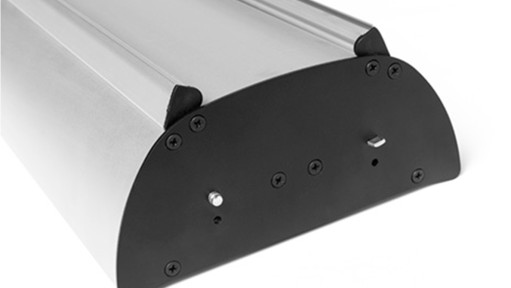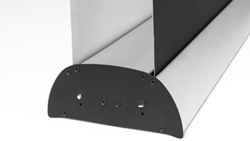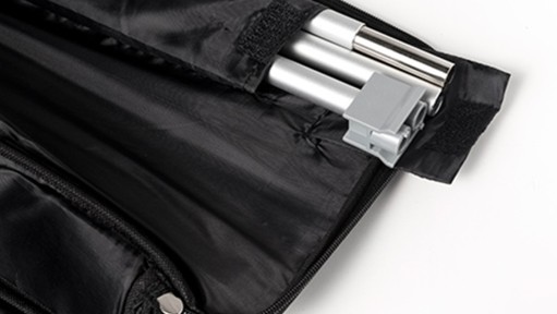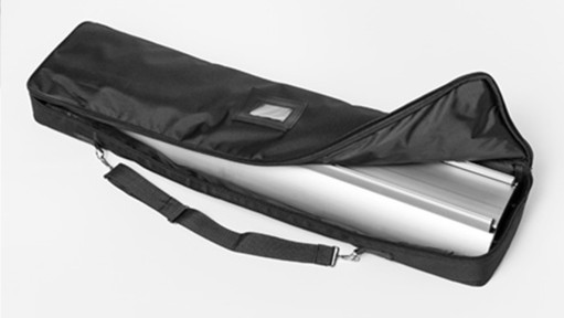 Oboustranný prezentační systém včetně základny s chromovými prvky a hliníkové tyče s pevnou výškou. Pro snadné přenášení včetně polyesterového vaku s extra kapsou na tyč.