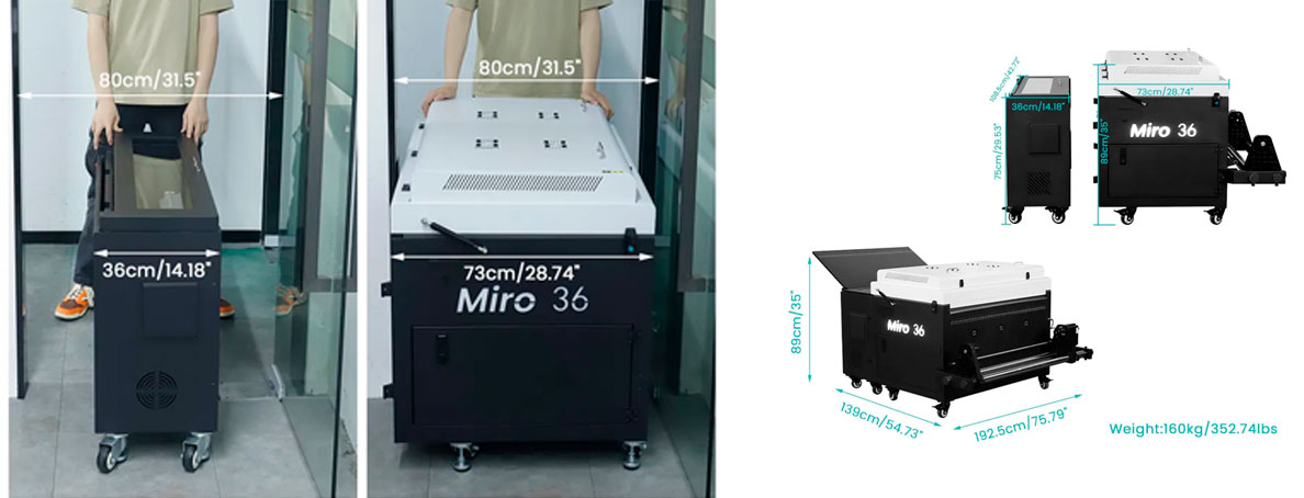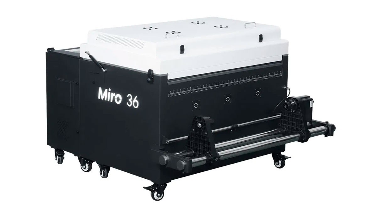 Miro 36 Shaker je kompatibilní s jakoukoli DTF tiskárnou s šířkou tisku do 90 cm (36”) a rychlostí pod 9 m²/hod, což z něj činí flexibilní řešení pro různá pracoviště.