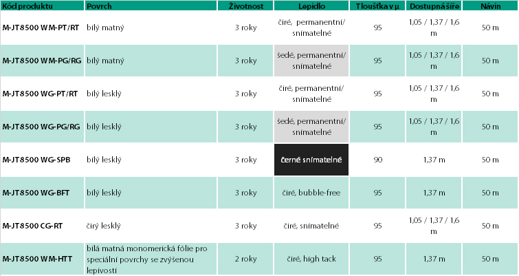 JT 8500 - 95μm monomerický PVC film Mactac. Životnost 3 roky (JT 8500 WM-HTT 2 roky), dostupná šíře 105, 137, 160 cm, návin 50 m. Doporučená laminace Mactac řada LF 8500.