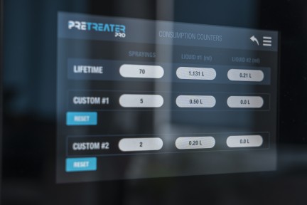 PreTreater Pro je vybaven automatickým recirkulačním systémem pro obě kapaliny, aby byla zajištěna homogenita kapaliny a odvrácena její sedimentace. Každá zakázka je ošetřena přesně stejným tlakem, čímž je dosaženo opakovatelnosti a pevné výroby. Opakovaně použitelné a omyvatelné filtry na nádržích a tryskách je chrání před usazeninami, a tím zajišťují konzistentní postřikové vzory. Systém nabízí přesné nastavení po 1 ml množství stříkané kapaliny na konkrétní oblast, kterou si vyberete (rozsah množství 14-40 ml). Eliminujete tak zbytečný nástřik na místa, která později nevyužijete k tisku. Snadno si vyberte konkrétní „lineární“ oblast postřiku (min. 10x1cm - max. 41x60 cm) nebo „Grid“ šachovnici, kde si jednoduše vyberete nesouvislou plochu postřiku (min. 15x10cm - max. 41x60 cm) podle potřeby, bez přebytečného tekutého odpadu.